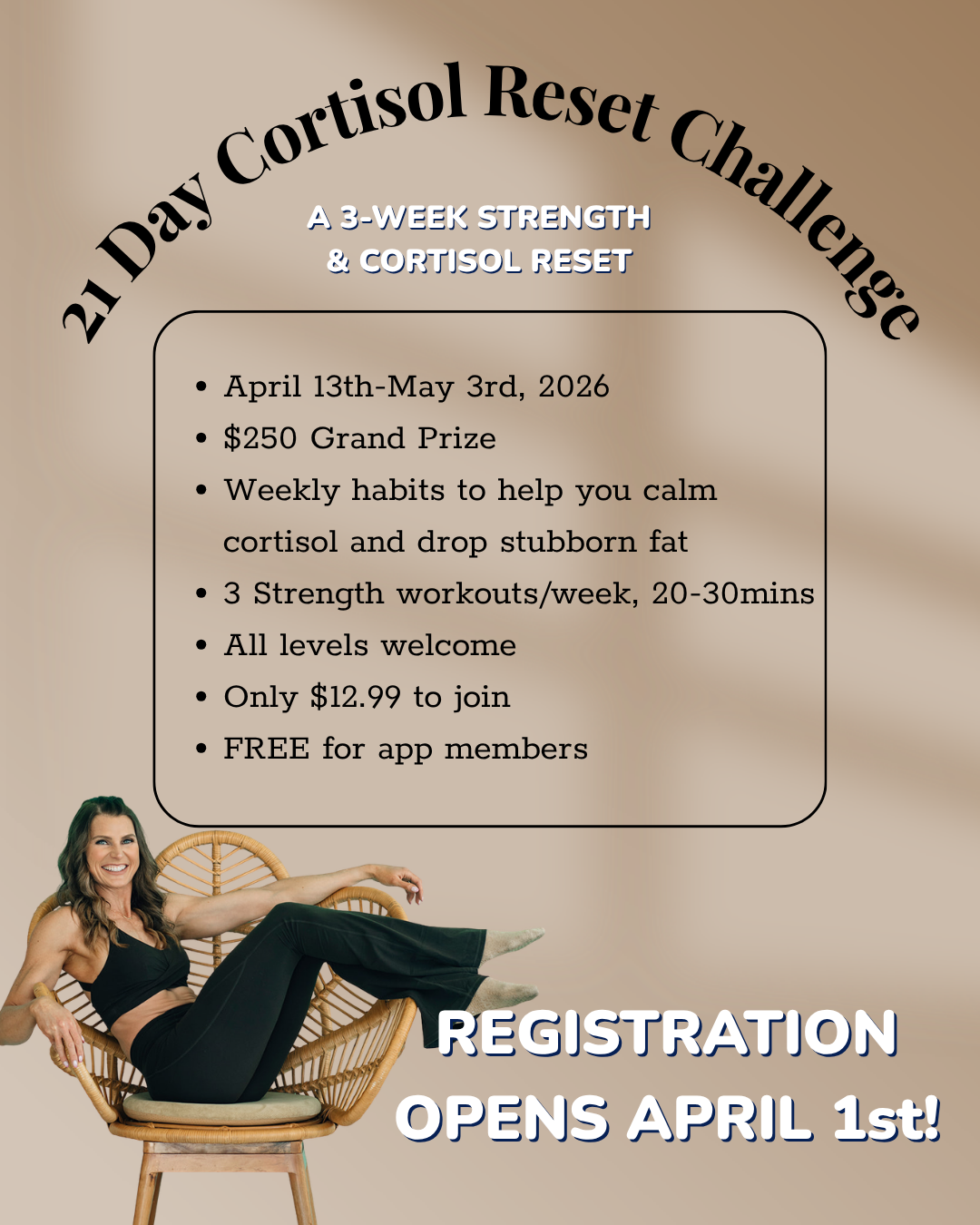 The 21-Day Cortisol Reset Challenge focuses on lowering your overall stress load while supporting your metabolism, strength, and recovery.